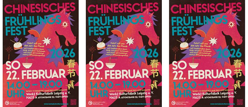 Am 22. Februar 2026 laden wir euch herzlich ein, gemeinsam mit uns im Werk 2 – Kulturfabrik Leipzig e.V. das Jahr des Pferdes zu begrüßen. Von 14:00 bis 19:00 Uhr erwartet euch in Halle A ein vielfältiges Programm: authentische Speisen, kunsthandwerkliche Stände mit kreativen Arbeiten und ein abwechslungsreiches Mitmachangebot für Groß und Klein.