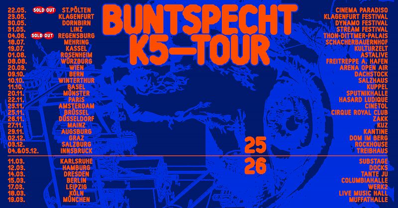 Die Popmusik von Buntspecht ist von einer dystopischen Romantik, einer radikalen wilden Schönheit, einer wahnsinnigen Intensität sowie von einer Aufrichtigkeit und künstlerischen Freiheit, die in diesen Tagen ihresgleichen sucht. Mit dem außergewöhnlichen neuem Album “Konstrukt 5” konnte die Band zum ersten Mal in die deutschen Charts einsteigen. Buntspecht sind eine mitreißende Live-Band, wer sie einmal gesehen hat, wird das nicht wieder vergessen. Beinahe jeder ihrer Songs öffnet ein neues Universum, weist in eine andere Richtung, aber alle zusammen bilden sie auf nahezu magische Weise eine Einheit, ein homogenes Werk. Buntspecht gelingt es, aus der Vielzahl ihrer Einflüsse ein stimmiges Ganzes und somit einen zauberhaft schwelgerischen Indie-Kammerpop-Sound zu formen. Niemand klingt aktuell wie Buntspecht. Sie sind ganz allein da draußen.