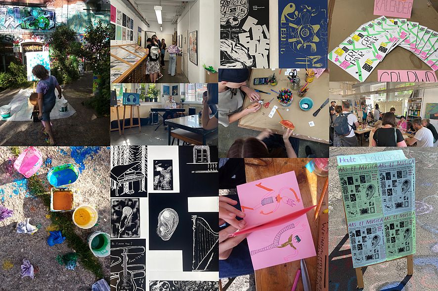 Eröffnung mit Musik von Mats + Kunst aus den Kinder-und Jugendkursen + Workshops: Beutel bemalen / Farbbälle werfen / Blubberblasen-Kunst / Lass sie tanzen – das Comic-Heft / Legodruck & Buttongestaltung (ausgedacht, vorbereitet und begleitet durch die Jugendlichen selbst) von 16:30 bis 19:00 in den Räumen der Grafikdruckwerkstatt sowie auf der Freifläche vor der Werkstatt.