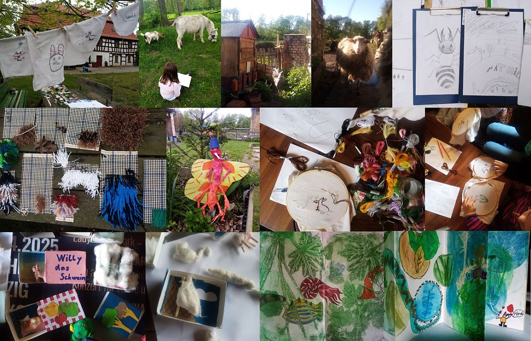 Auf der diesjährigen Kunstfahrt mit insgesamt 18 Kurskindern (Theater und Bildende Kunst) ging es darum, die Vielfalt der Pflanzen und Tiere auf dem Bauernhofgelände genau wahrzunehmen, zu fühlen (Wie fühlt sich die Wiese und der Kieselsteinweg für die nackten Füße an?), zu beobachten (Zeichnen in der Natur) und das Erlebte in den künstlerischen Prozess (verschiedene Workshops) einfließen zu lassen.